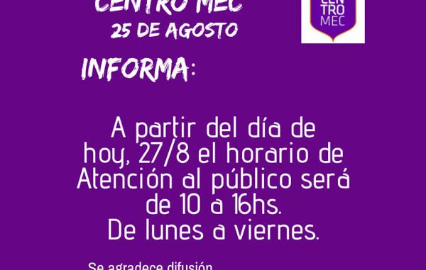 El Centro MEC de nuestra villa informa sobre nuevo horario de atención al público que comenzó a regir desde la pasada jornada.
