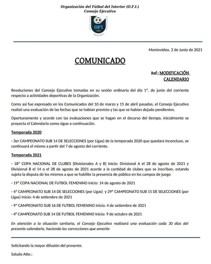 04.06.2021 Novedades de OFI: cambio en el calendario para este año 4 junio, 2021 Carlos Garcia Deportes 0 La Organización del Fútbol del Interior comunicó sobre un nuevo cambio en el calendario. Compartimos la resolución a continuación: OFI
